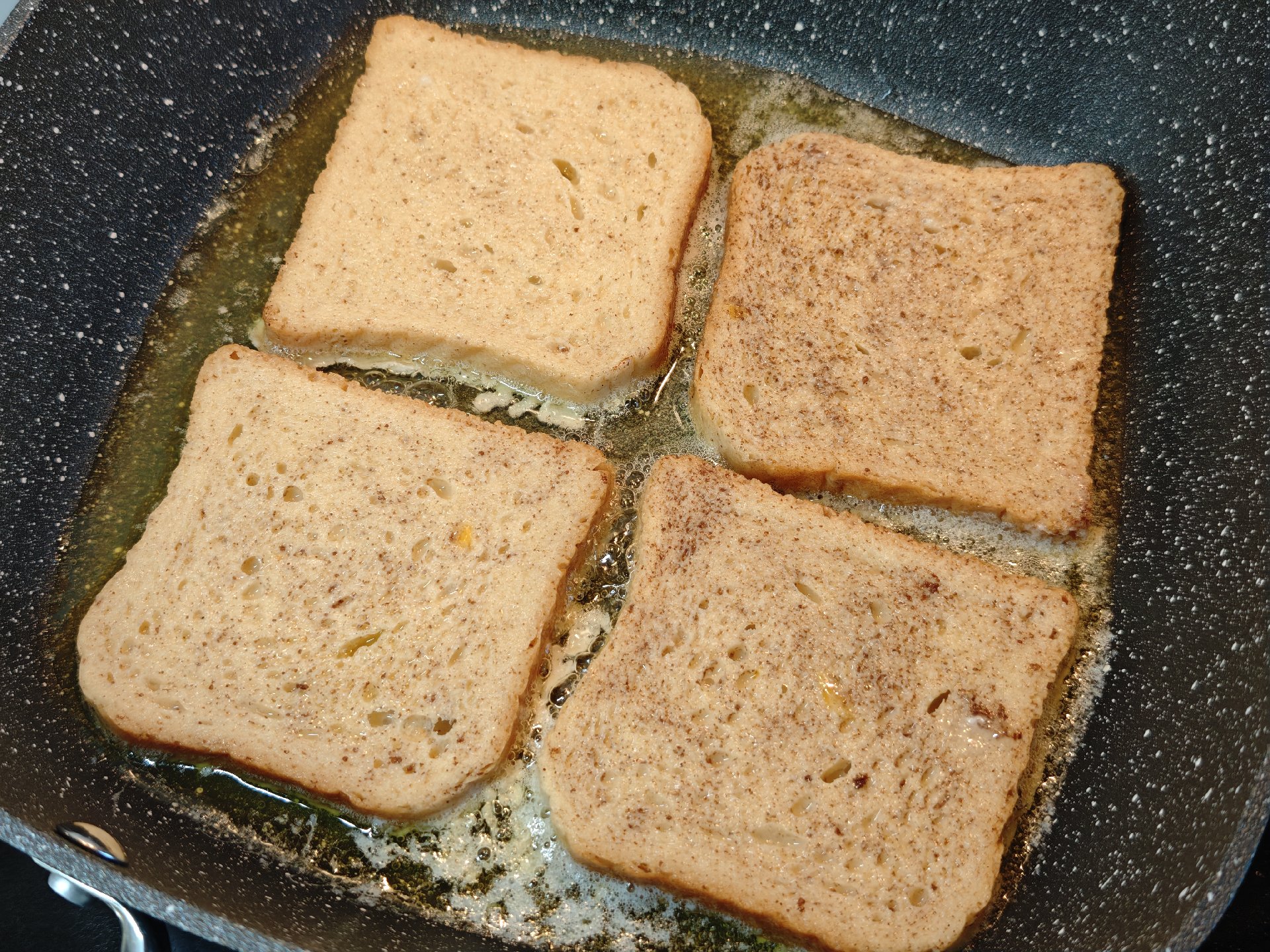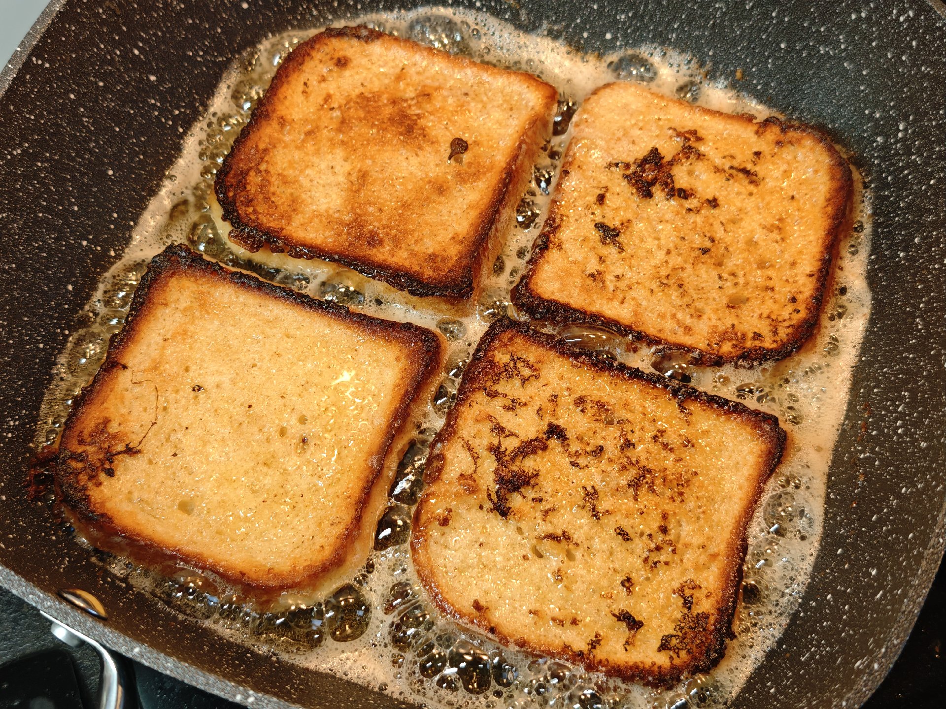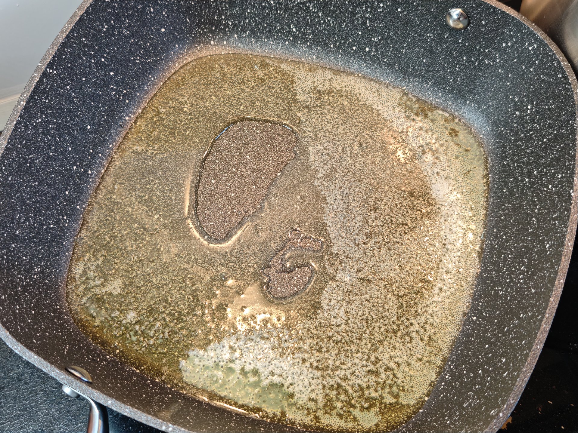 V pánvi na střední teplotu rozpálíme lžící oleje a trošku másla. Olej je tam proto, aby se nám máslo nepálilo. Másla dejte akorát, jelikož nám bude během smažení ubývat a my ho budeme po troškách zase přidávat :-) Použil jsem čtvercovou pánev, do které se mi krásně vešly 4 tousty.