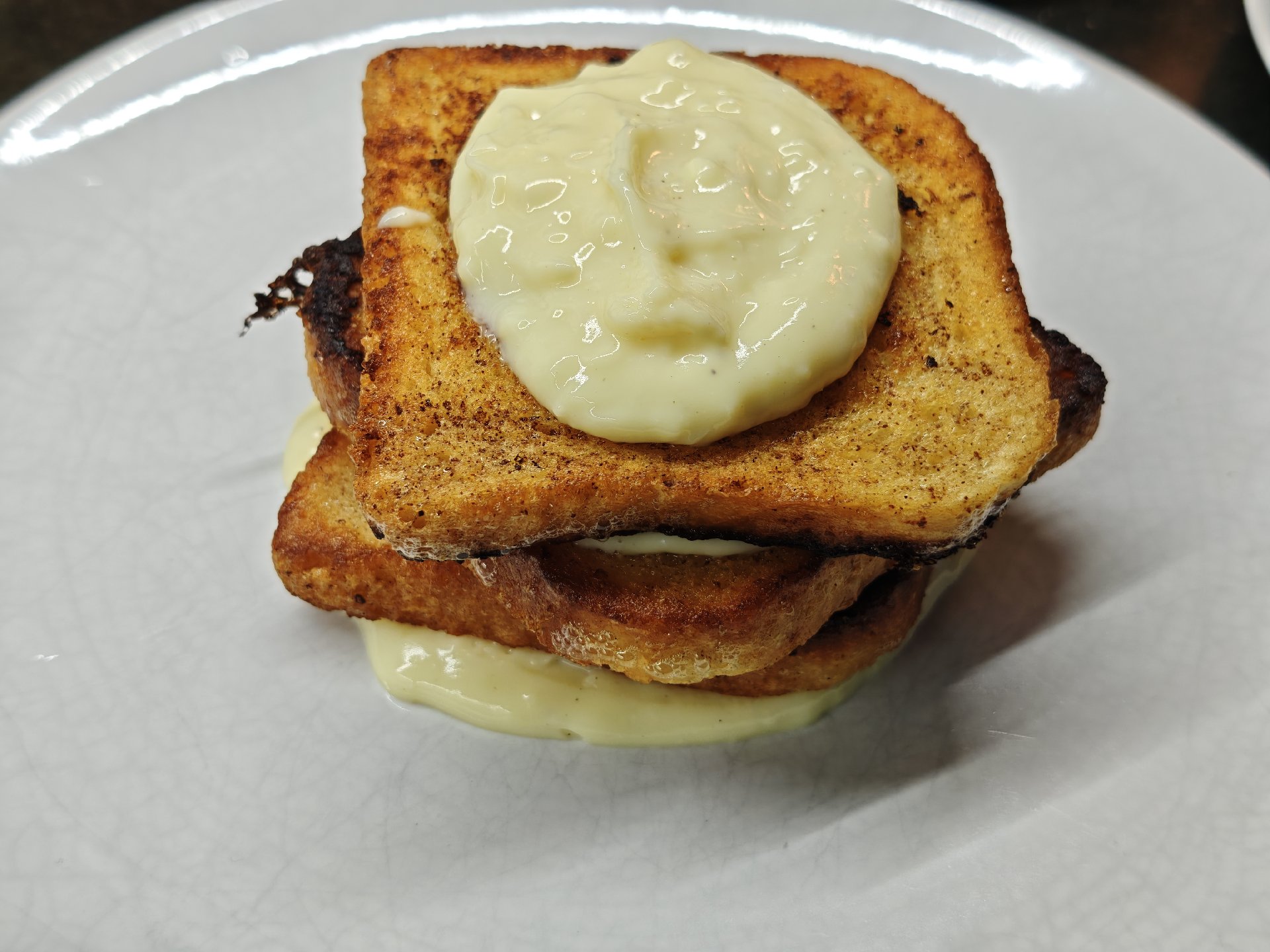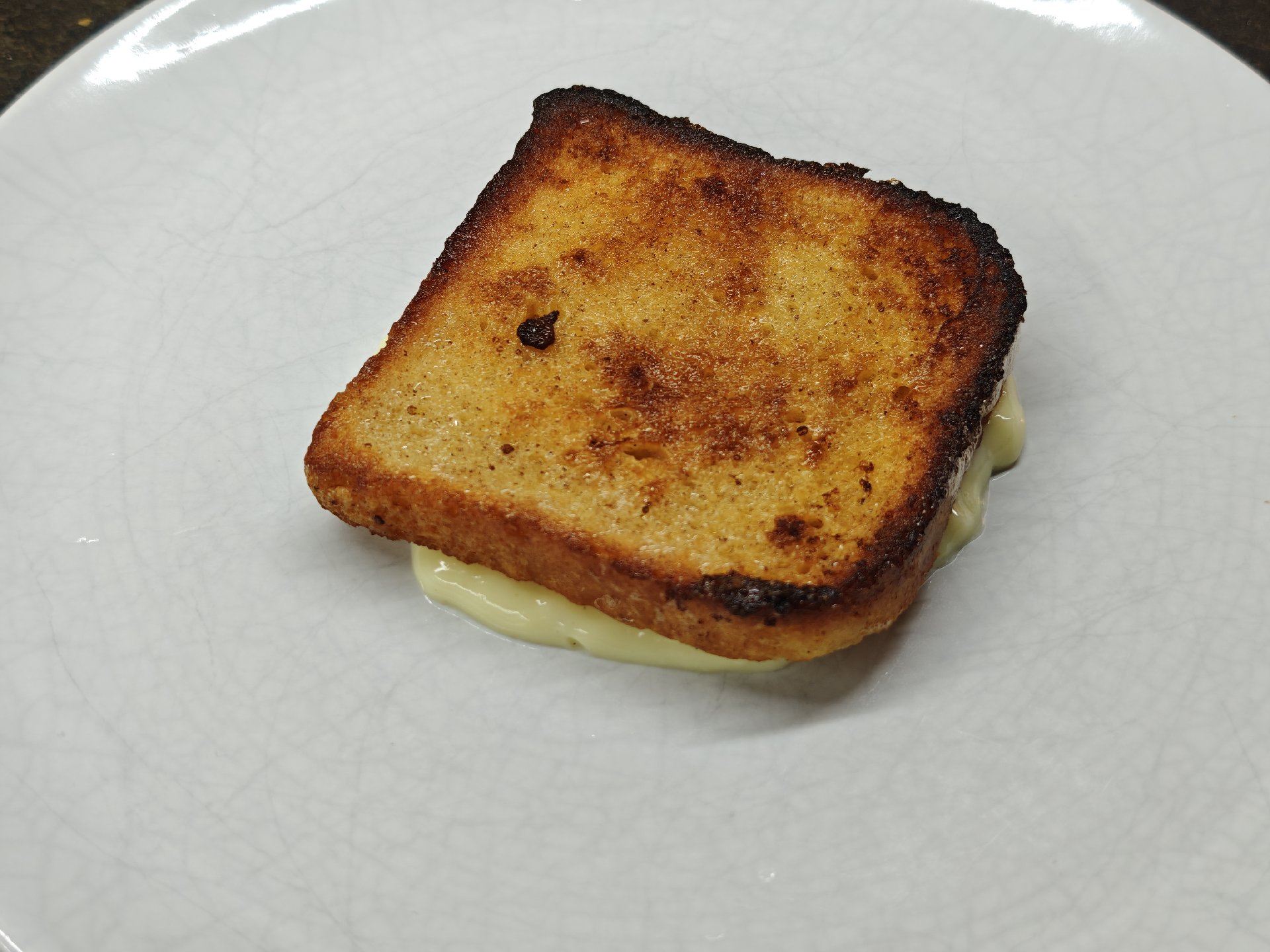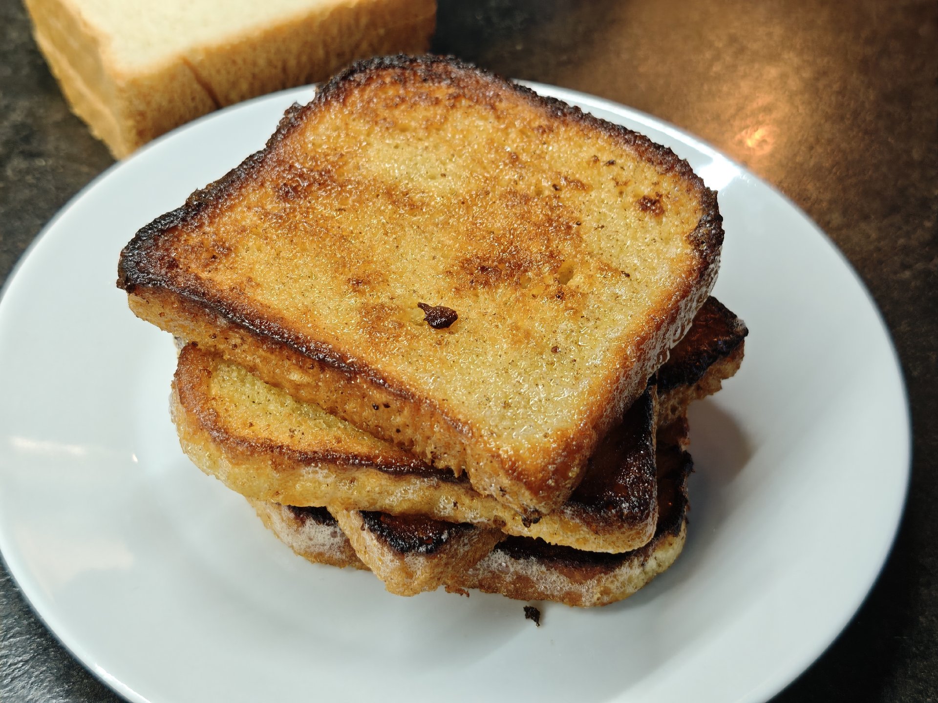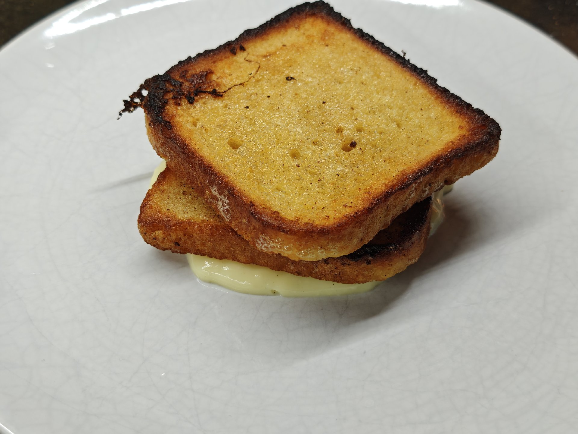 V pánvi na střední teplotu rozpálíme lžící oleje a trošku másla. Olej je tam proto, aby se nám máslo nepálilo. Másla dejte akorát, jelikož nám bude během smažení ubývat a my ho budeme po troškách zase přidávat :-) Použil jsem čtvercovou pánev, do které se mi krásně vešly 4 tousty.