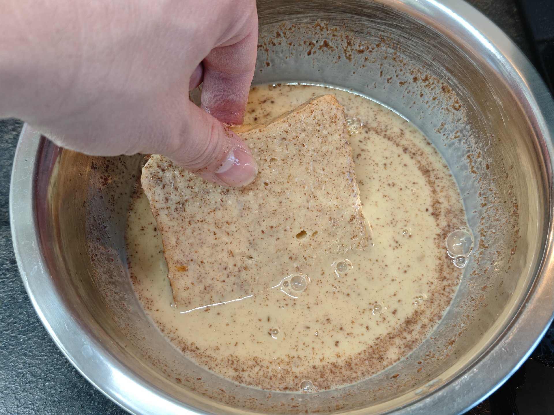 Vezmeme si toust a párkrát ho vymácháme v těstě. Oklepeme přebytečné těsto o mísu a dáme do pánve.
